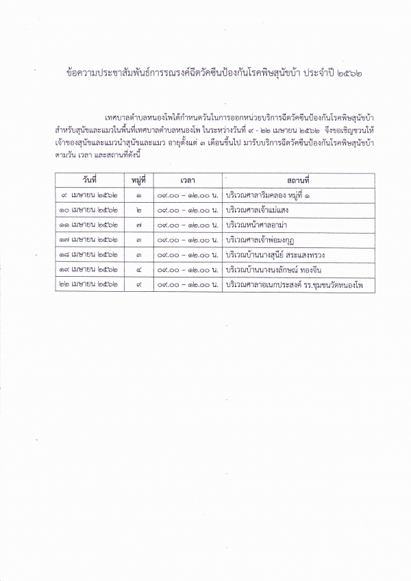 กำหนดวันในการออกหน่วยบริการฉีดวัคซีนป้องกันโรคพิษสุนัขบ้าสำหรับสุนัขและแมวในพื้นที่่เทศบาลตำบลหนองโพ