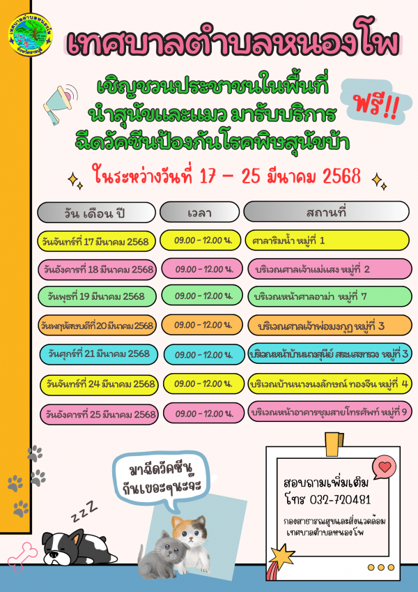 ด้วยกองสาธารณสุขและสิ่งแวดล้อม ได้จัดทำโครงการสัตว์ปลอดโรค คนปลอดภัย จากโรคพิษสุนัขบ้า ประจำปีงบประมาณ 2568 เพื่อป้องกันและควบคุมการแพร่ระบาดของโรคพิษสุนัขบ้าในพื้นที่เทศบาลตำบลหนองโพ โดยได้กำหนดออกหน่วยบริการฉีดวัคซีนป้องกันโรคพิษสุนัขบ้าสำหรับสุนัขและแมว ในพื้นที่เทศบาลตำบลหนองโพ ในระว่างวันที่ 17 - 25 มีนาคม 2568