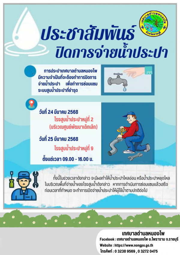 การประปาเทศบาลตำบลหนองโพ มีความจำเป็นที่จะต้องทำการปิดการจ่ายน้ำประปา เพื่อทำการซ่อมแซมระบบสูบน้ำประปาที่ชำรุด