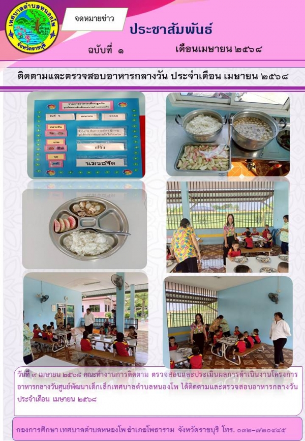 เมื่อวันที่ 9 เมษายน 2568 คณะทำงานการติดตาม ตรวจสอบและประเมินผลการดำเนินโครงการอาหารกลางวันศูนย์พัฒนาเด็กเล็กเทศบาลตำบลหนองโพ ได้ติดตามและตรวจสอบอาหารกลางวัน ประจำเดือน เมษายน 2568