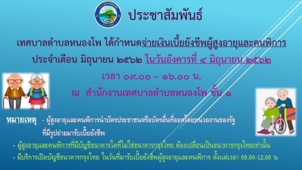 การรับเบี้ยยังชีพและเบี้ยคนพิการ เขตเทศบาลตำบลหนองโพ ประจำเดือน มิถุนายน 2562