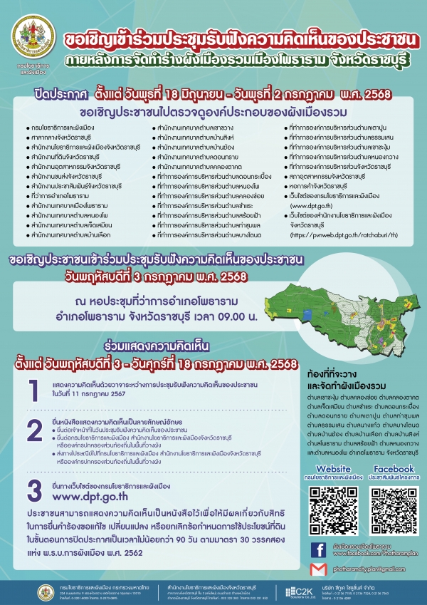 ขอเชิญร่วมประชุมรับฟังความคิดเห็นต่อประชาชน ภายหลังการจัดทำร่างผังเมืองรวมเมืองโพธาราม จังหวัดราชบุรี