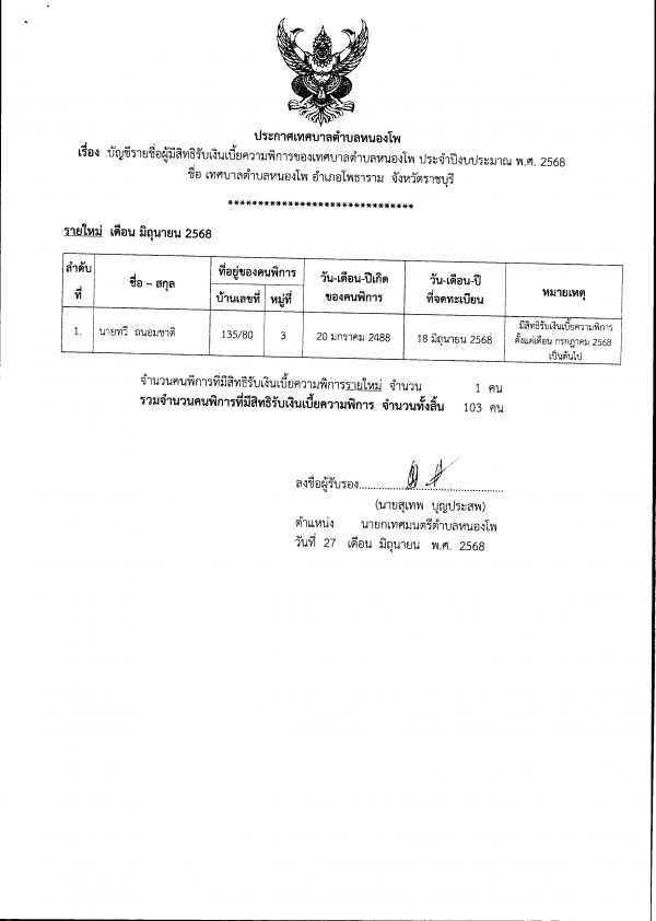 บัญชีรายชื่อผู้มีสิทธิรับเงินเบี้ยความพิการฯ ปีงบประมาณ 2568 ประจำเดือนมิถุนายน 2568