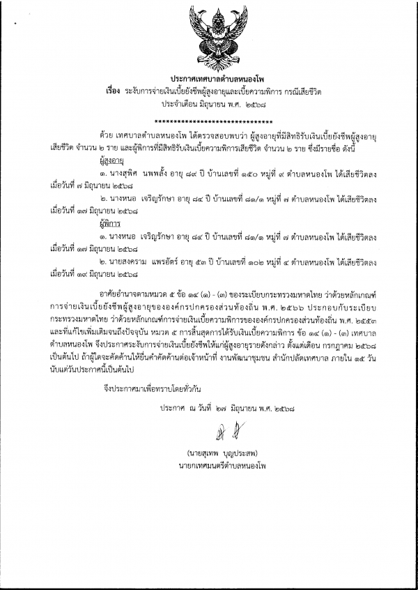 ระงับการจ่ายเงินเบี้ยยังชีพผู้สูงอายุและเบี้ยความพิการ กรณีเสียชีวิต ประจำเดือนมิถุนายน 2568