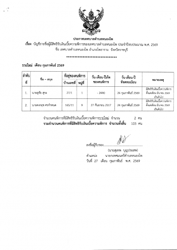 บัญชีรายชื่อผู้มีสิทธิรับเงินเบี้ยความพิการ ประจำปีงบประมาณ 2569 รายใหม่ เดือนกุมภาพันธุ์ 2569