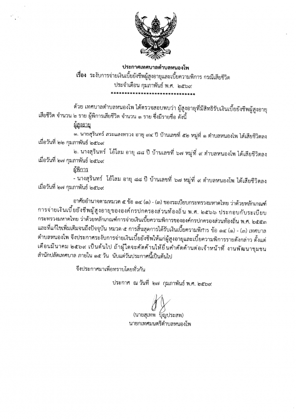 ระงับการจ่ายเงินเบี้ยยังชีพผู้สูงอายุและเบี้ยความพิการ(กรณีเสียชีวิต) ประจำเดือนกุมภาพันธ์ 2569