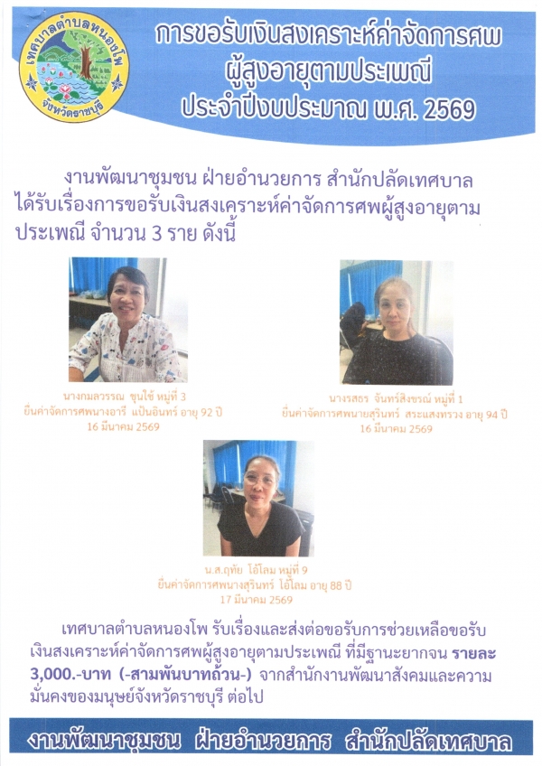 การขอรับเงินสงเคราะห์ค่าจัดการศพผู้สูงอายุตามประเพณี ประจำปีงบประมาณ 2569 ราย 1)นางอารี แป้นอินทร์ 2)นายสุรินทร์ สระสงทรวง 3)นางสุริทนร์ โอ้โลม