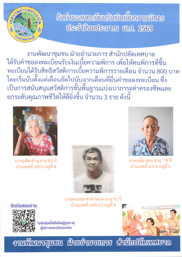 รับคำขอลงทะเบียนรับเงินเบี้ยความพิการ จำนวน 3 ราย 1)นางอุทิศ คำนุ อายุ 83 ปี 2)นายอุทัย สุขะ อายุ 79 ปี 3)นายคงกฤช ศรกำหนด อายุ 51 ปี