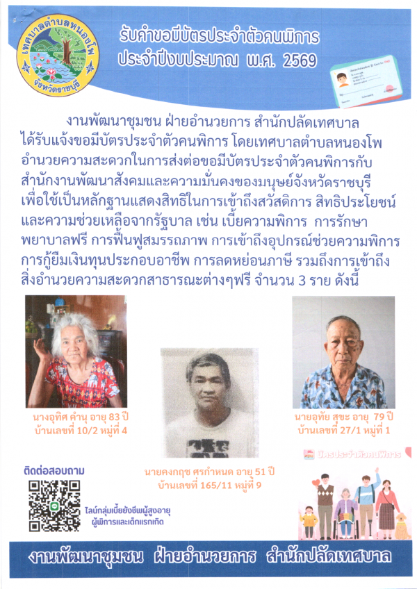 รับคำขอมีบัตรประจำตัวคนพิการ จำนวน 3 ราย 1)นางอุทิศ คำนุ อายุ 83 ปี 2)นายอุทัย สุขะ อายุ 79 ปี 3)นายคงกฤช ศรกำหนด อายุ 51 ปี