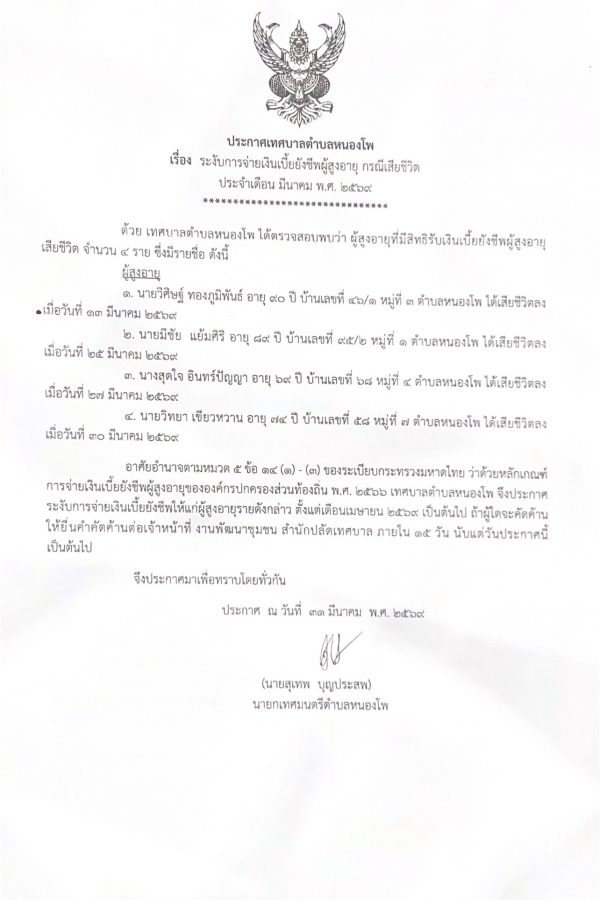 ระงับการจ่ายเงินเบี้ยยังชีพผู้สูงอายุ กรณีเสียชีวิต ประจำเดือนมีนาคม 2569