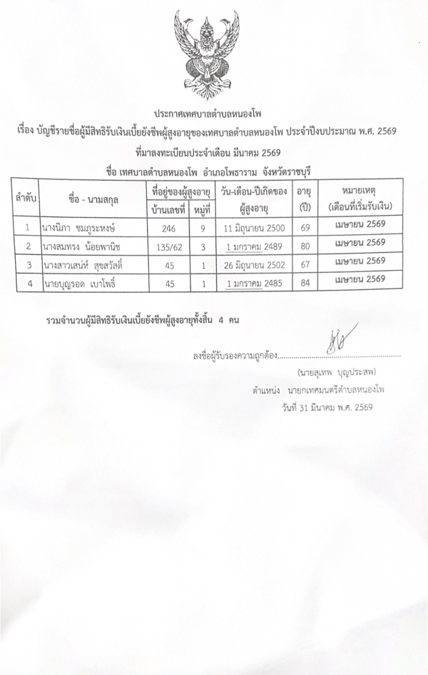บัญชีรายชื่อผู้มีสิทธิรับเงินเบี้ยยังชีพผู้สูงอายุที่มาลงทะเบียน ประจำเดือนมีนาคม 2569