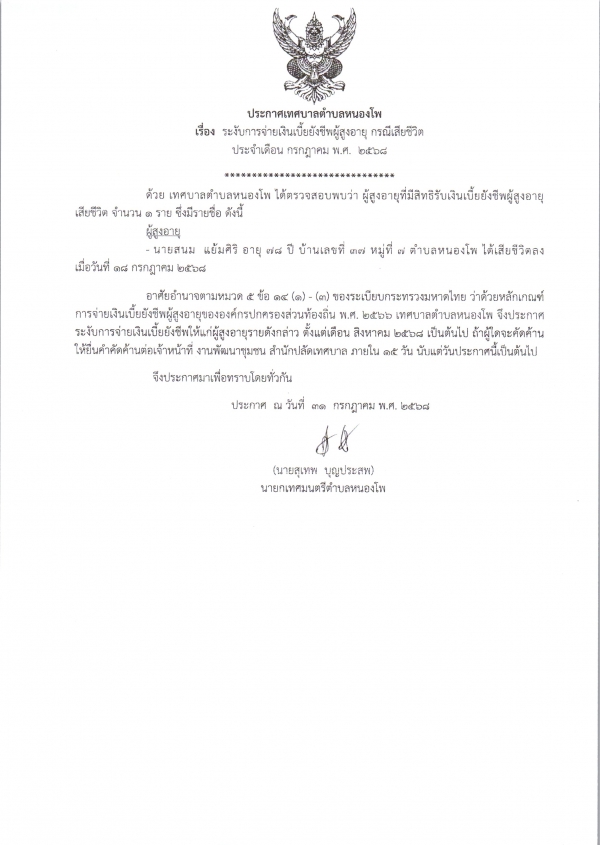 ระงับการจ่ายเงินเบี้ยยังชีพผู้สูงอายุ (กรณีเสียชีวิต) ประจำเดือน กรกฎาคม พ.ศ.2568