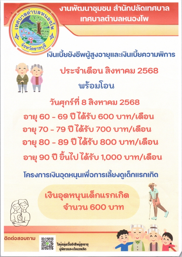 กำหนดโอนเงินเบี้ยยังชีพผู้สูงอายุ เงินเบี้ยความพิการและเงินอุดหนุนเด็กแรกเกิด ประจำเดือน สิงหาคม 2568