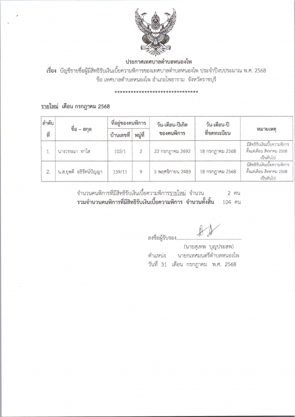 บัญชีรายชื่อผู้มีสิทธิรับเงินเบี้ยความพิการของเทศบาลตำบลหนองโพ ประจำปีงบประมาณ พ.ศ.2568