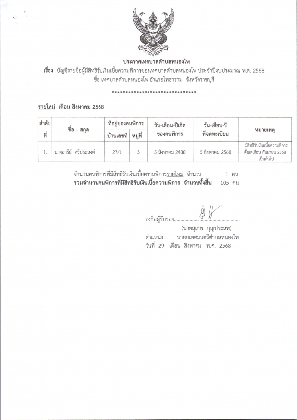 บัญชีรายชื่อผู้มีสิทธิรับเงินเบี้ยยังชีพความพิการฯ ประจำปี 2568