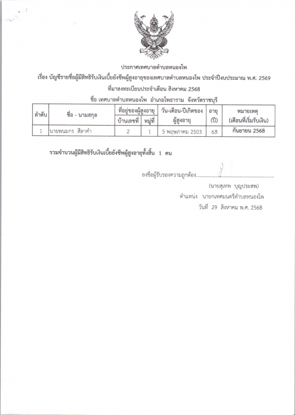 บัญชีรายชื่อผู้มีสิทธิรับเงินเบี้ยยังชีพผู้สูงอายุของเทศบาลตำบลหนองโพ ประจำปีงบประมาณ 2568 ที่มาลงทะเบียนประจำเดือน สิงหาคม 2568
