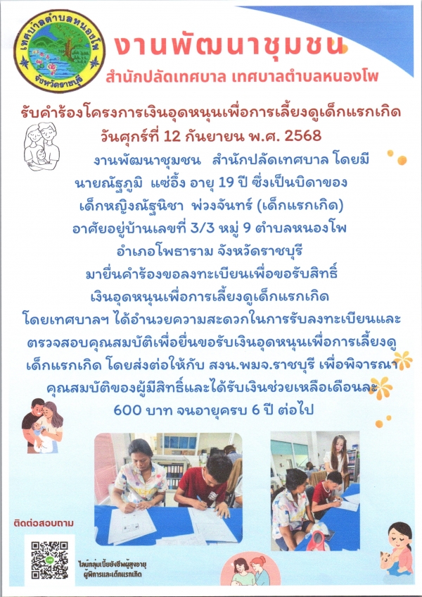 รับคำร้องโครงการเงินอุดหนุนเพื่อการเลี้ยงดูเด็กแรกเกิด ราย ด.ญ.ณัฐนิชา พ่วงจันทร์ (เด็กแรกเกิด)