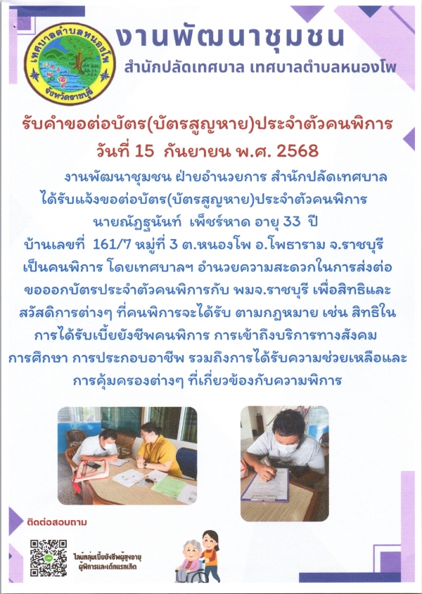 รับคำขอมีบัตรประจำตัวคนพิการ (เนื่องจากบัตรสูญหาย) นายณัฎฐนันท์ เพ็ชร์หาด
