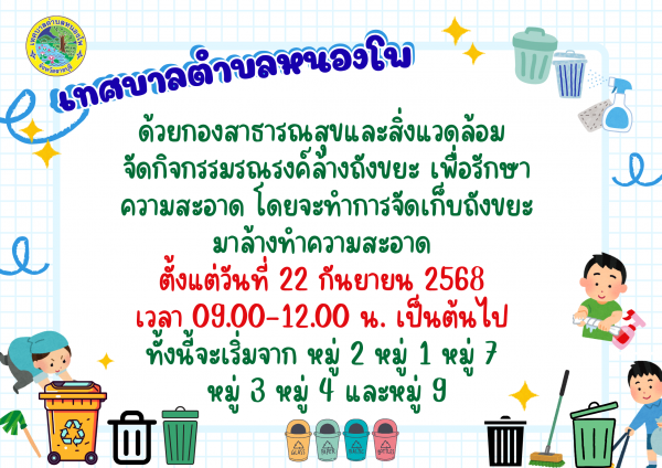กองสาธารณสุขและสิ่งแวดล้อม จัดกิจกรรมรณรงค์ล้างถังขยะ เพื่อรักษาความสะอาด โดยจะทำการจัดเก็บขยะมาล้างทำความสะอาด ตั้งแต่วันที่ 22 กันยายน 2568 เวลา 09.00 - 12.00 น. เป็นต้นไป ทั้งนี้จะเริ่มจาก หมู่ที่ 2 หมู่ที่ 1 หมู่ที่ 3 หมู่ที่ 4 และหมู่ที่ 9