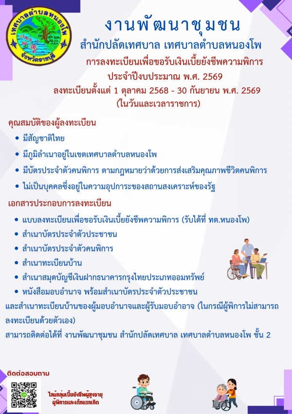 การรับลงทะเบียนเพื่อขอรับเงินเบี้ยยังชีพความพิการ ประจำปีงบประมาณ พ.ศ.2569 ลงทะเบียนตั้งแต่ 1 ตุลาคม พ.ศ.2568 - 30 กันยายน พ.ศ.2569 (ในวันและเวลาราชการ)