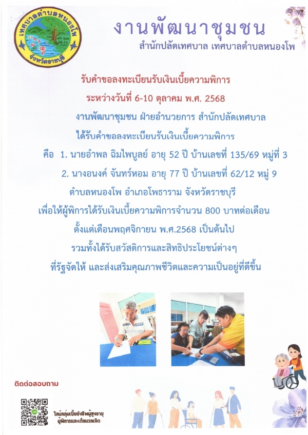 รับลงทะเบียนรับเงินเบี้ยความพิการ ประจำปีงบประมาณ พ.ศ.2569