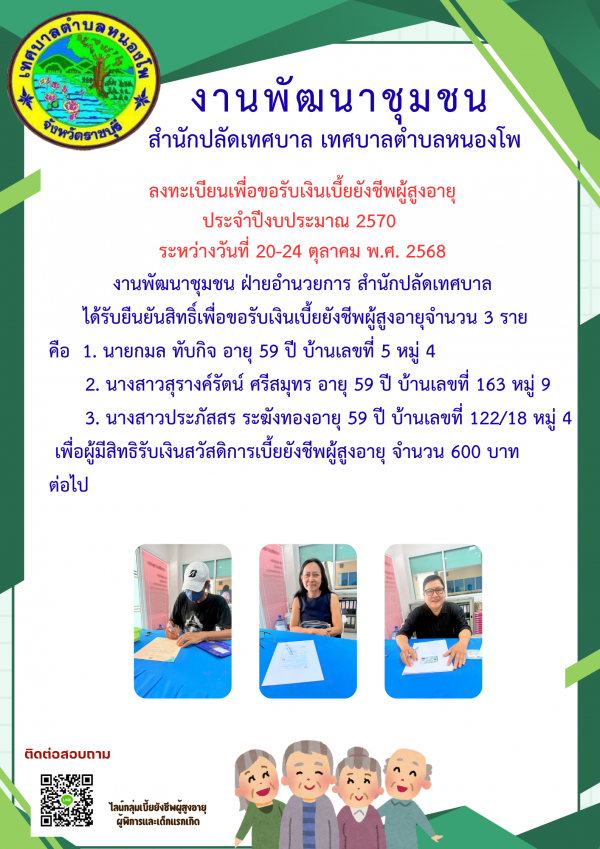 ลงทะเบียนเพื่อขอรับเงินเบี้ยยังชีพผู้สูงอายุ ประจำปีงบประมาณ พ.ศ.2570 (ตั้งแต่ 20- 24 ตุลาคม พ.ศ. 2568)