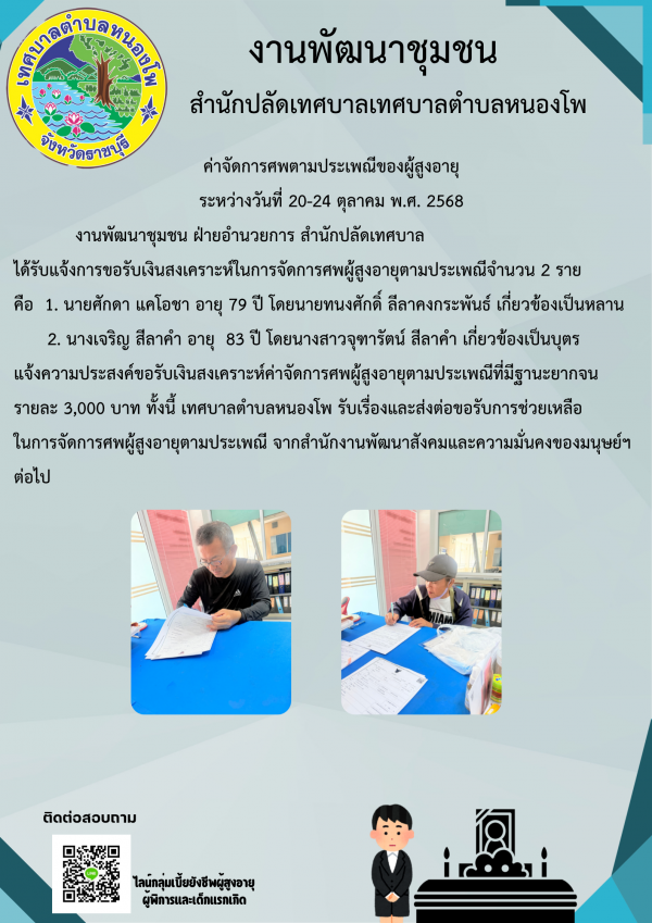 รับคำขอค่าจัดการศพตามประเพณีของผู้สูงอายุ จำนวน 2 ราย