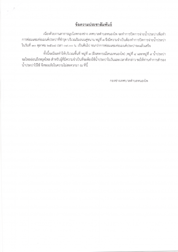 ปิดจ่ายน้ำประปาเนื่องจากท่อเมนต์ประปาชำรุด