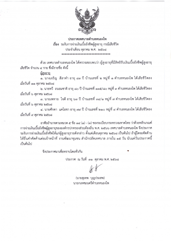 ระงับการจ่ายเงินเบี้ยยังชีพผู้สูงอายุและเบี้ยความพิการ (กรณีเสียชีวิต) ประจำเดือน พฤศจิกายน พ.ศ. 2568