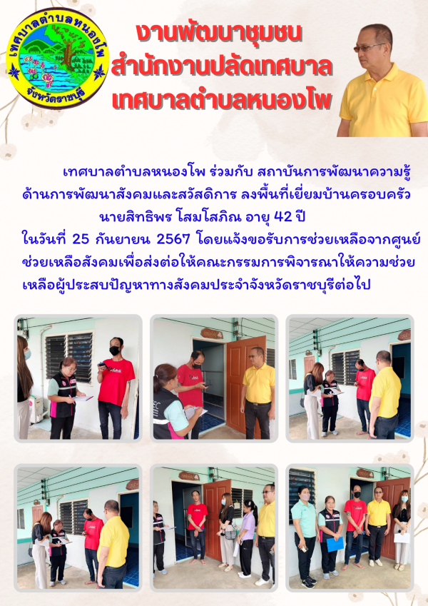 ประชาสัมพันธ์เทศบาลตำบลหนองโพร่วมกับสถาบันการพัฒนาความรู้ด้านการพัฒนาสังคมและสวัสดิการ ลงพื้นที่เยี่ยมบ้านและครอบครัว นายสิทธิพร โสมโสภิณ