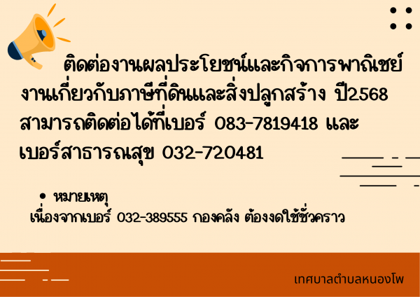 ติดต่องานผลประโยชน์และกิจการพาณิชย์ งานเกี่ยวกับภาษีที่ดินและสิ่งปลูกสร้าง ปี2568 สามารถติดต่อได้ที่เบอร์ 083-7819418 และ
