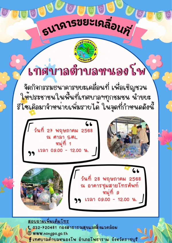 กองสาธารณสุข เทศบาลตำบลหนองโพ ได้จัดกิจกรรมธนาคารขยะเคลื่อนที่ จึงขอเชิญชวนประชาชนในพื้นที่เทศบาล นำขยะรีไซเคิลมาจำหน่ายเพื่อเพิ่มรายได้