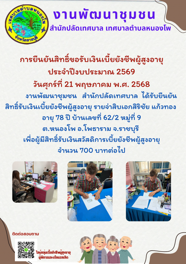 การยืนยันสิทธิ์ขอรับเงินเบี้ยยังชีพผู้สูงอายุ ประจำปี 2569 รายจ่าสิบเอกสิริชัย แก้วทอง อายุ 78 ปี บ้านเลขที่ 62/2 หมู่ที่ 9 ตำบลหนองโพ อำเภอโพธาราม จังหวัดราชบุรี