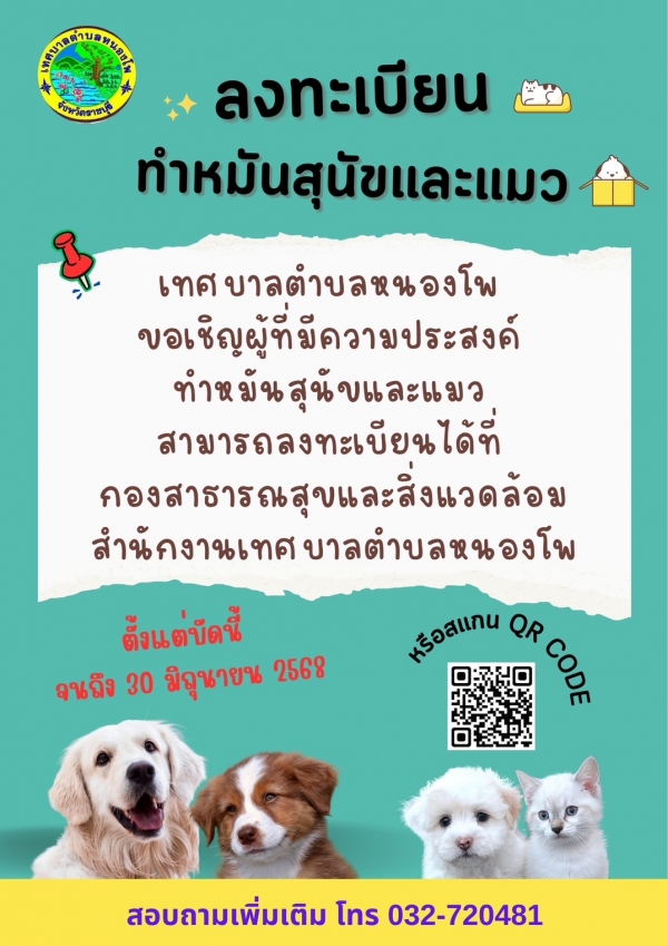 รับลงทะเบียนทำหมันสุนัขและแมวในพื้นที่เทศบาลตำบลหนองโพ