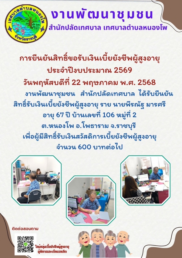 การยืนยันสิทธิ์ขอรับเงินเบี้ยยังชีพผู้สูงอายุ ประจำปี 2569 ราย นายพีรณัฐ มารศรี อายุ 67 ปี บ้านเลขที่ 106 หมู่ที 2 ตำบลหนองโพ อำเภอโพธาราม จังหวัดราชบุรี