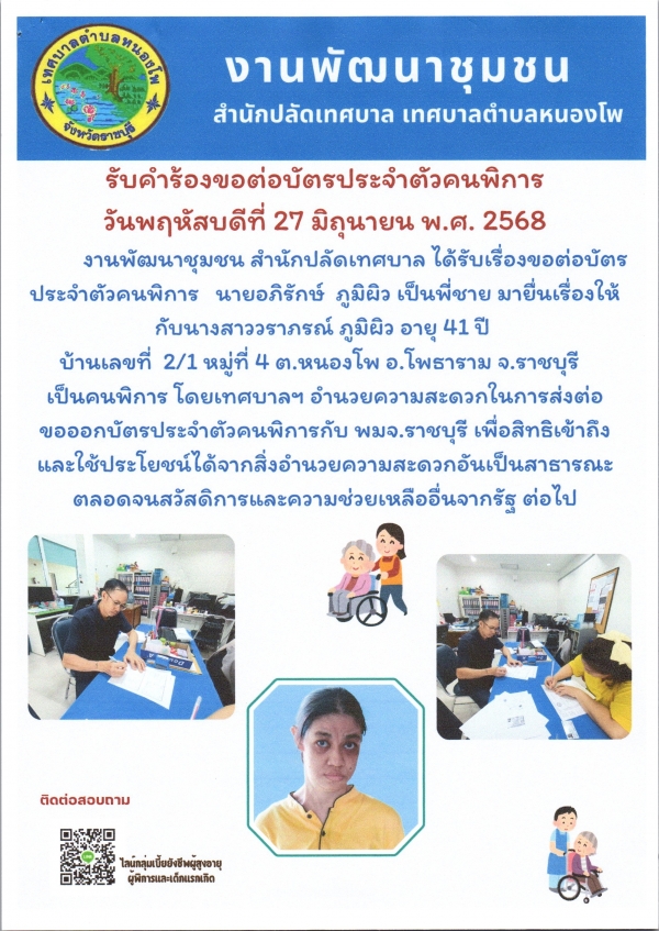 รับคำร้องขอมีบัตรประจำตัวคนพิการ นางสาววราภรณ์ ภูมิผิว