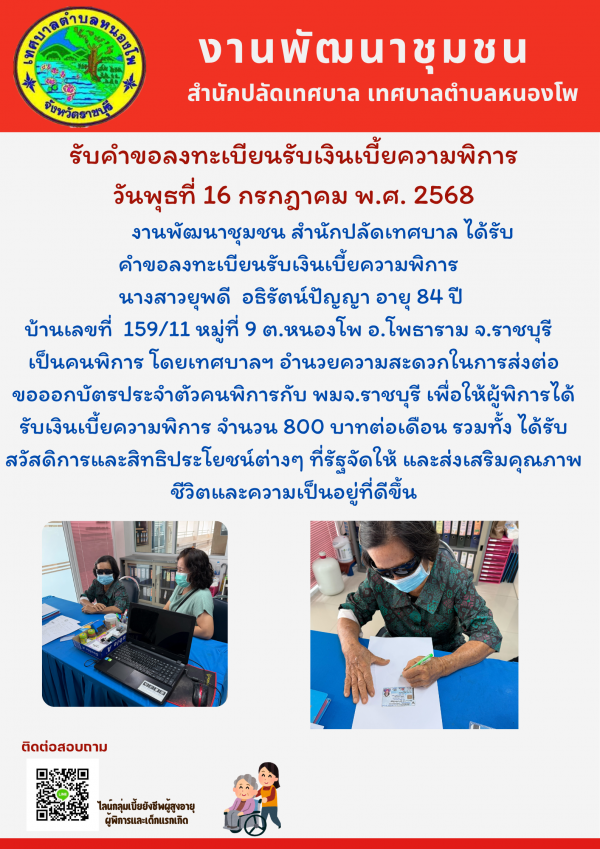 รับคำขอลงทะเบียนรับเงินเบี้ยความพิการ ให้กับ น.ส.ยุพดี อธิรัตน์ปัญญา
